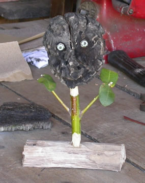 My move to the Algarve saw a further development of creative style . . . and a new combination of artistic outlets. This, my first sculpt in Portugal, expresses the effect that the big events of life in the forested mountainside, have been having on me . . . and how I've been coming to terms with them. It's constructed of eucalyptus, from seed pod (eyes) through young shoot (body) to chopped down trunk (base). The head is a piece of wood, found on our estate, turned almost to charcoal by fires here a few years ago: